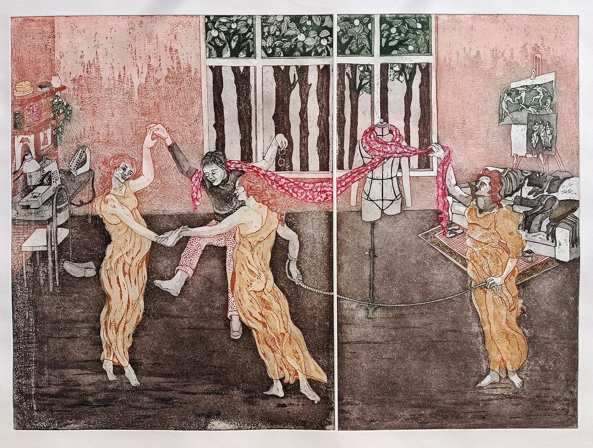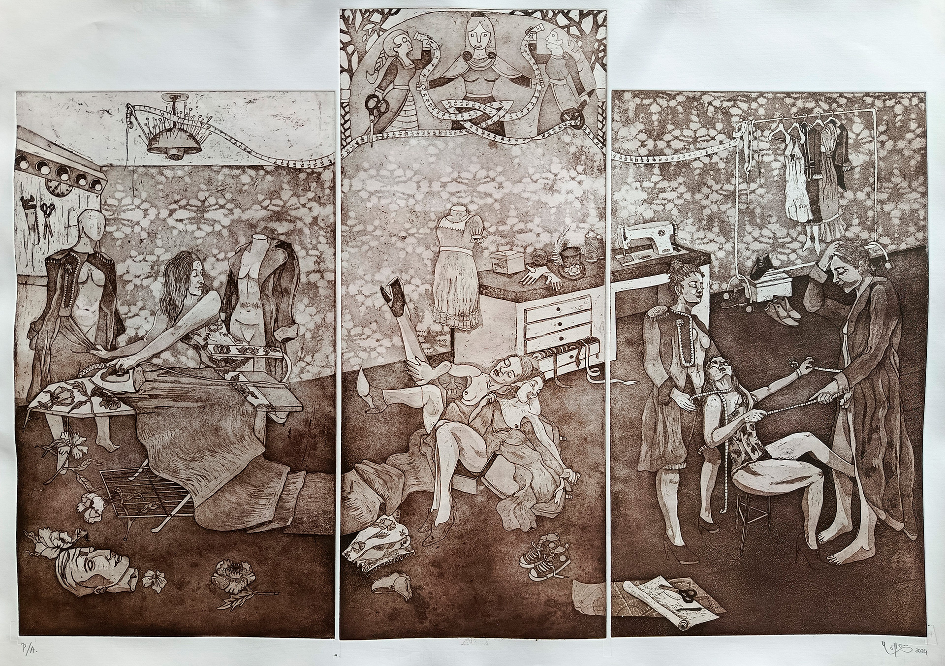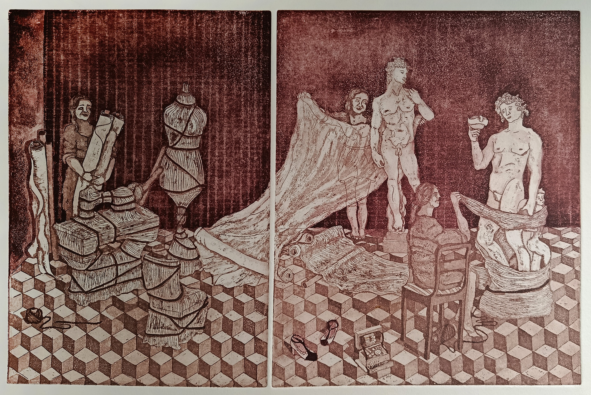 The use of fabric, lace, thread or clothing in her moulds for engraving triggers the discovery of the textile world which she incorporates in a decisive way into her creative process after working with Malcon Cristian for a period of time. Due to this, she creates a series of dynamic works in which it is the observer who makes an image according to the way the different levels of fabric are organized. As a known textile artist, she takes part in several exhibits and halls. She is awarded with an honorary mention at the Palais de Glace – National Palace of the Arts in 2008. She holds an individual exhibit during the 2009 International Biennial of Textile Art. She is also chosen to participate in the 2009 Biennial Hall of the Sivori Museum.