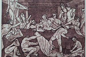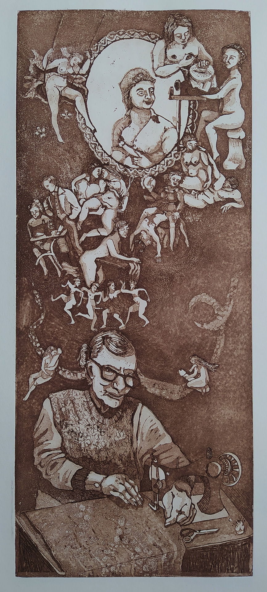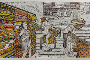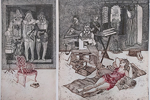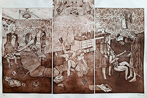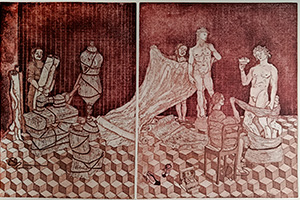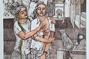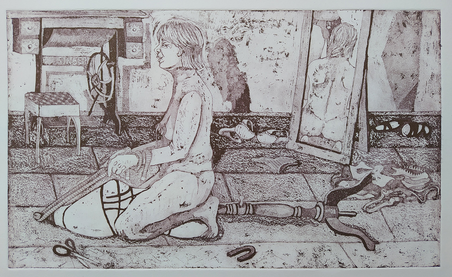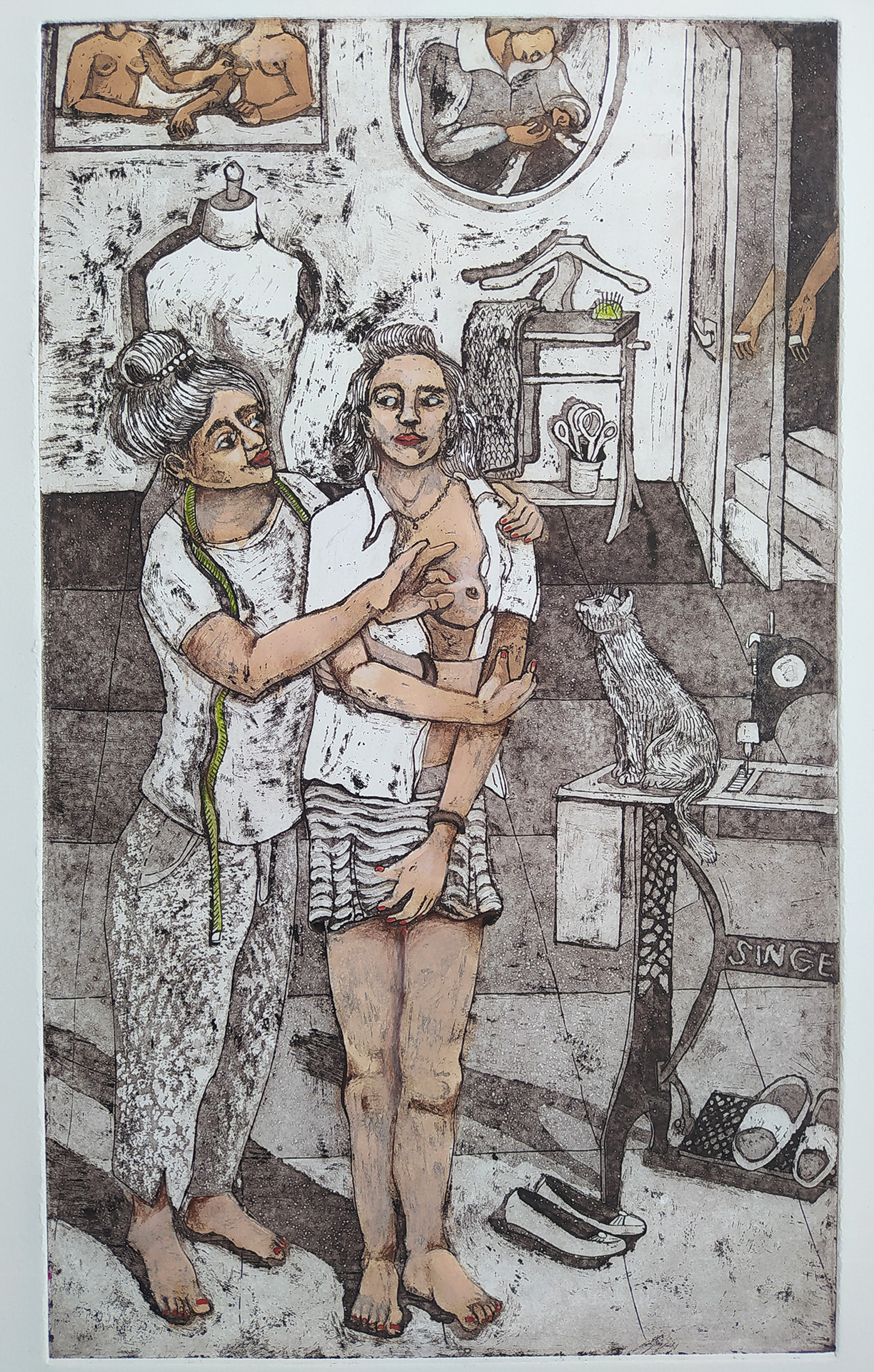 The use of fabric, lace, thread or clothing in her moulds for engraving triggers the discovery of the textile world which she incorporates in a decisive way into her creative process after working with Malcon Cristian for a period of time. Due to this, she creates a series of dynamic works in which it is the observer who makes an image according to the way the different levels of fabric are organized. As a known textile artist, she takes part in several exhibits and halls. She is awarded with an honorary mention at the Palais de Glace – National Palace of the Arts in 2008. She holds an individual exhibit during the 2009 International Biennial of Textile Art. She is also chosen to participate in the 2009 Biennial Hall of the Sivori Museum.